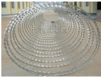 刀片刺網(wǎng)的刀片刺繩系列產(chǎn)品的統(tǒng)稱,又稱蛇腹網(wǎng)或刮刀型刺網(wǎng),焊接刀片刺網(wǎng), 是從海外引進(jìn)的新型安全隔離產(chǎn)品,是將熱鍍鋅材質(zhì)的鋼板沖壓切割成銳利的尖刀形狀,然后包裹在具有高張力的鋼絲(筋絲)之上。通常使用雙根線扣卡子組裝成蛇腹?fàn)睿哂杏幸欢ǖ娜犴g性,不易攀爬的阻絕器材。鋒利的刀型刺由雙線扣裝后成蛇腹?fàn)睿让烙^又讓人不寒而粟,起到了很好的洞嚇作用。所以能起到很有效的震懾作用。是一種近年來防護(hù)、隔離能力較強(qiáng)的新型產(chǎn)品。