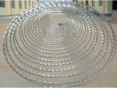 監獄刀片刺網又名刺絲滾籠,是一種發展起來的防護、隔離能力較強的新型防護網產品。 鋒利的刀型刺由雙線扣裝后成蛇腹狀,既美觀又讓人不寒而栗。起到了很好的阻嚇作用。同時該產品具有美觀、防阻效果好、施工便利等優點。刀片刺繩的材質可分為鍍鋅和不銹鋼兩種,鍍鋅刀片刺繩在全國以及國外都非常受歡迎,加工工藝簡便,由沖壓成型的刀片與鋼絲結合,形成螺旋狀,經過卡扣工人依次連接,再進行包裝,就形成了用戶所見到的螺旋式刀片刺繩。不銹鋼刀片刺繩由于原材料與鍍鋅有所不同,含捏成分高,適合多種氣候變化,南方的雨季天氣和氣候多變的西部,以及海岸線都隨處可見,壽命長達20年之久,省去了中途更換的時間以及費用,安裝方法與鍍鋅刀片刺繩相同。