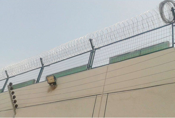 (三)監(jiān)獄護(hù)欄網(wǎng)網(wǎng)孔:50*50,50mm*100mm或其它規(guī)格可定、網(wǎng)片中帶有V型加強(qiáng)筋,可大大增強(qiáng)圍網(wǎng)的抗沖擊力、立柱為60*60/80*80的矩形鋼,頂端焊有V型之架。