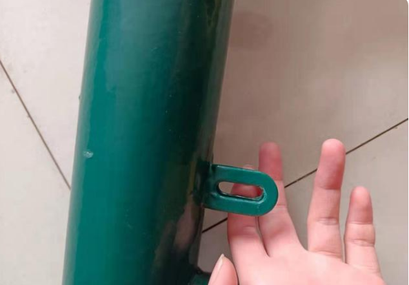 籃球場圍網焊接時首先焊接立柱、橫梁、立柱橫梁上都要焊接上U型卡,U型卡是用來固定鋼筋棍的。